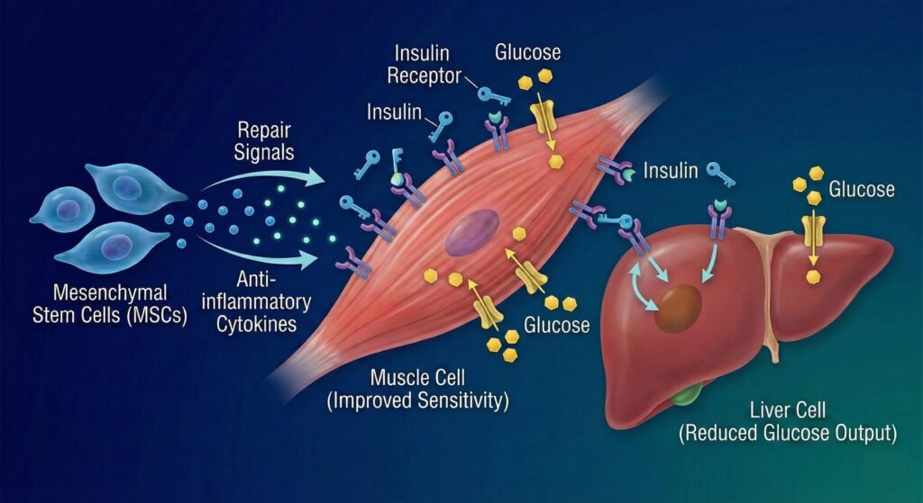 Stem cells improve the sensitivity of peripheral tissues (muscle, liver, and fat) to insulin. This allows cells to absorb glucose from the bloodstream more efficiently, lowering blood sugar levels naturally.